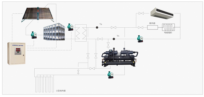 太陽能+地源熱泵三聯(lián)供系統(tǒng),冬季采暖、夏季制冷、全年熱水免費(fèi)用。太陽能利用率高,地源熱泵制熱效率年均4.0以上,運(yùn)行費(fèi)用低,節(jié)能減排,打造綠色、低碳體育場館。