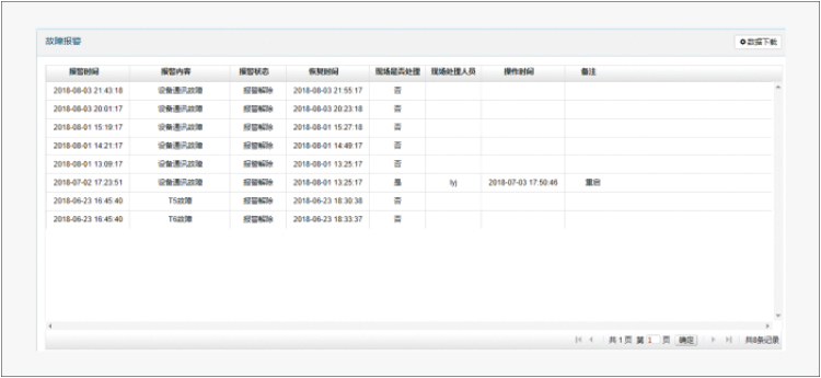 故障報警:顯示報警時間、內(nèi)容,報警是否解除和恢復(fù)時間、現(xiàn)場是否處理以及現(xiàn)場處理人員、操作時間等。