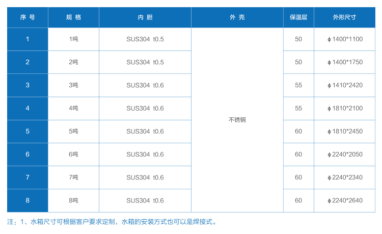 不銹鋼圓形保溫水箱 1、整板焊接,氬弧焊工藝,焊縫防腐性能強(qiáng)。 2、保溫采用整體發(fā)泡工藝,確保熱量低散失。 3、可根據(jù)用戶要求調(diào)整相關(guān)參數(shù)。