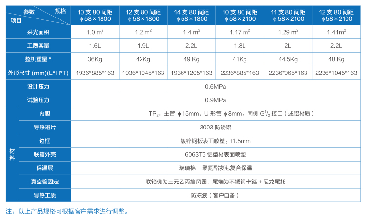 1、開放式框架、外觀簡潔大方,便于維修; 2、內部流道采用TP2銅管的U型結構,真空管內不走水,防治炸管傷人; 3、外殼材料為鋁合金噴塑,邊框為鍍鋅板噴塑,壽命長達15年以上。